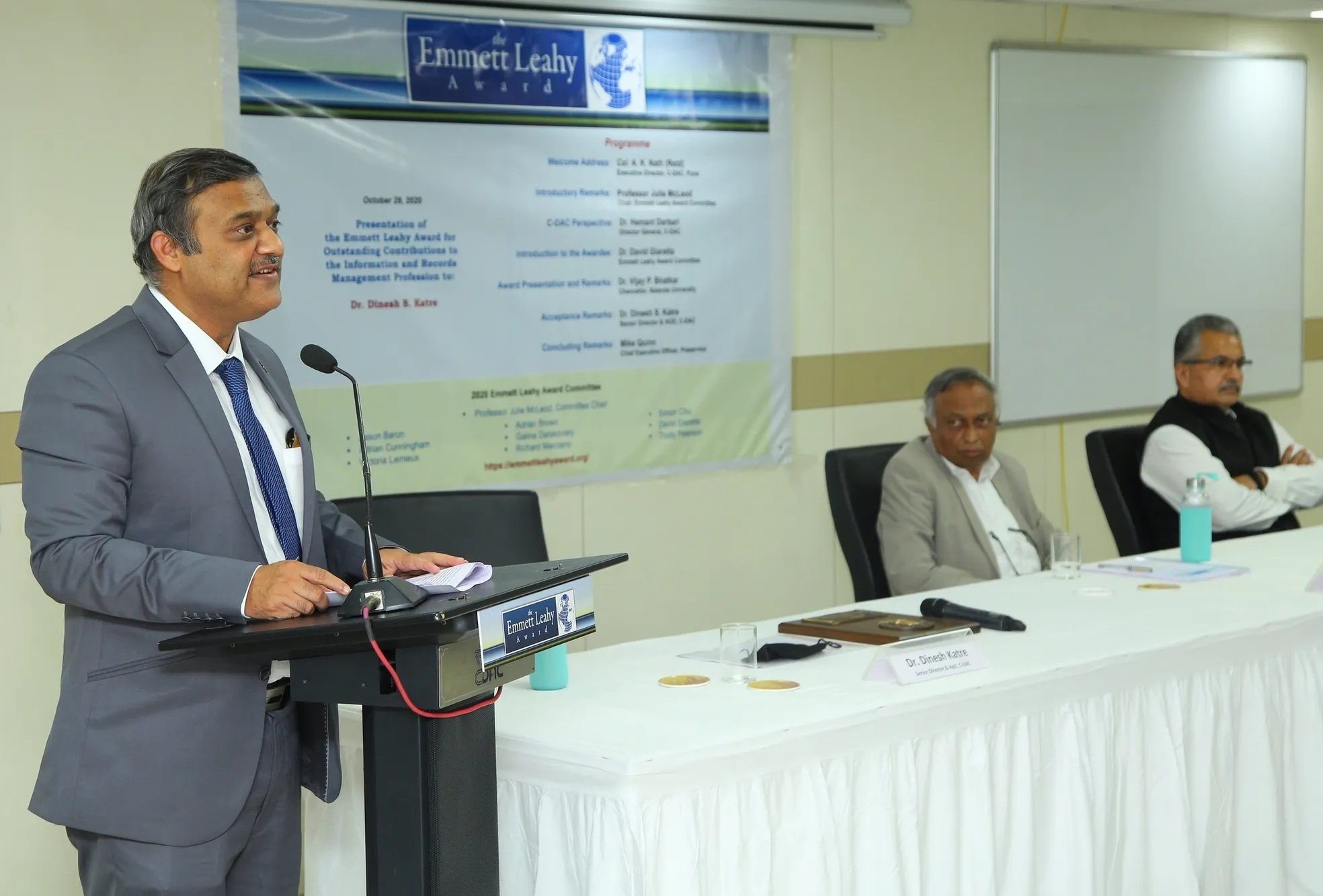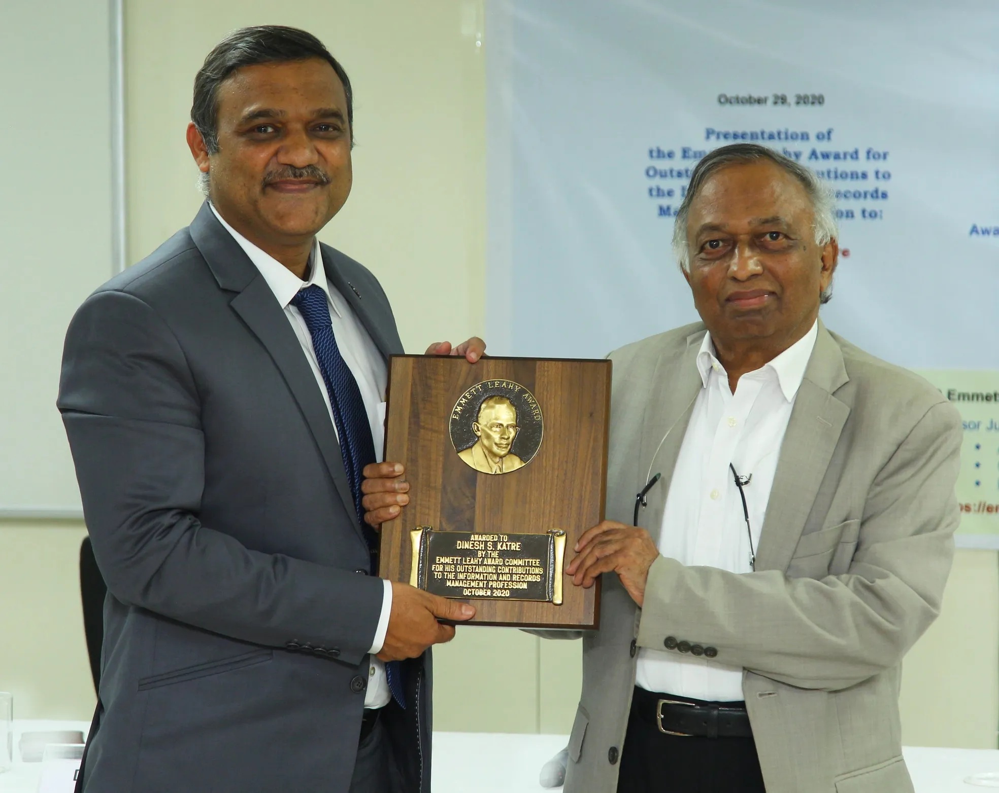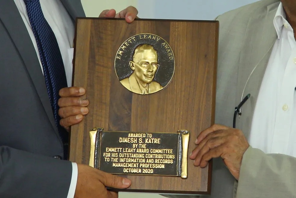 Three years after Leahy’s death, Rod Exelbert, editor of the newly formed Information Management Magazine, decided that he would use the magazine as a venue for the creation of the Emmett Leahy Award for Outstanding Contributions to the Records and Information Management Profession, in honor of Leahy. The first Award was presented in 1967 to Edward Rosse of the US Social Security Administration. It has been presented annually ever since, with only one break in continuity in the 1980s. Dr Katre is its first Indian sub-continent recipient.