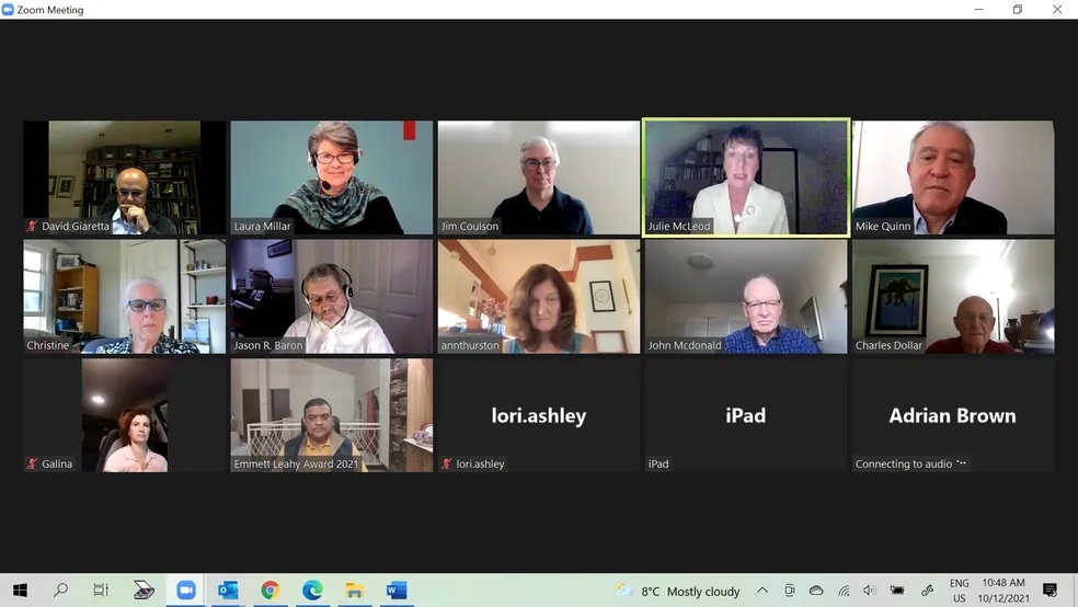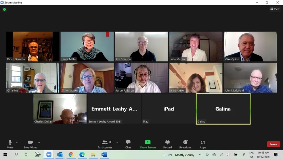 Hello, my name is Julie McLeod, and I have the honor of holding the title of Chair of the 2021 Emmett Leahy Award Committee. It’s my pleasure to welcome you all to this the presentation of the Emmett J. Leahy Award to Laura Millar for her Outstanding Contributions to the Records and Information Profession. Whilst there are some downsides to a virtual event, especially for the winner, one of the benefits is that many past winners are able to join from across the world – quite literally – making it an international event befitting of an international award.